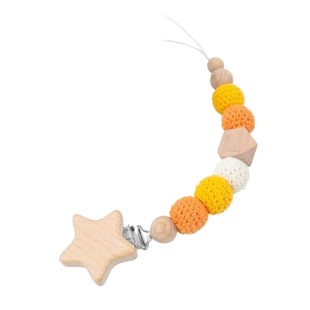 Prendedor de Chupetas Estrela é um produto feito à mão com materiais naturais, durável e seguro para o seu bebê. Feito de madeira de bambu e crochê é antialérgico, atóxico e livre de substâncias prejudiciais.